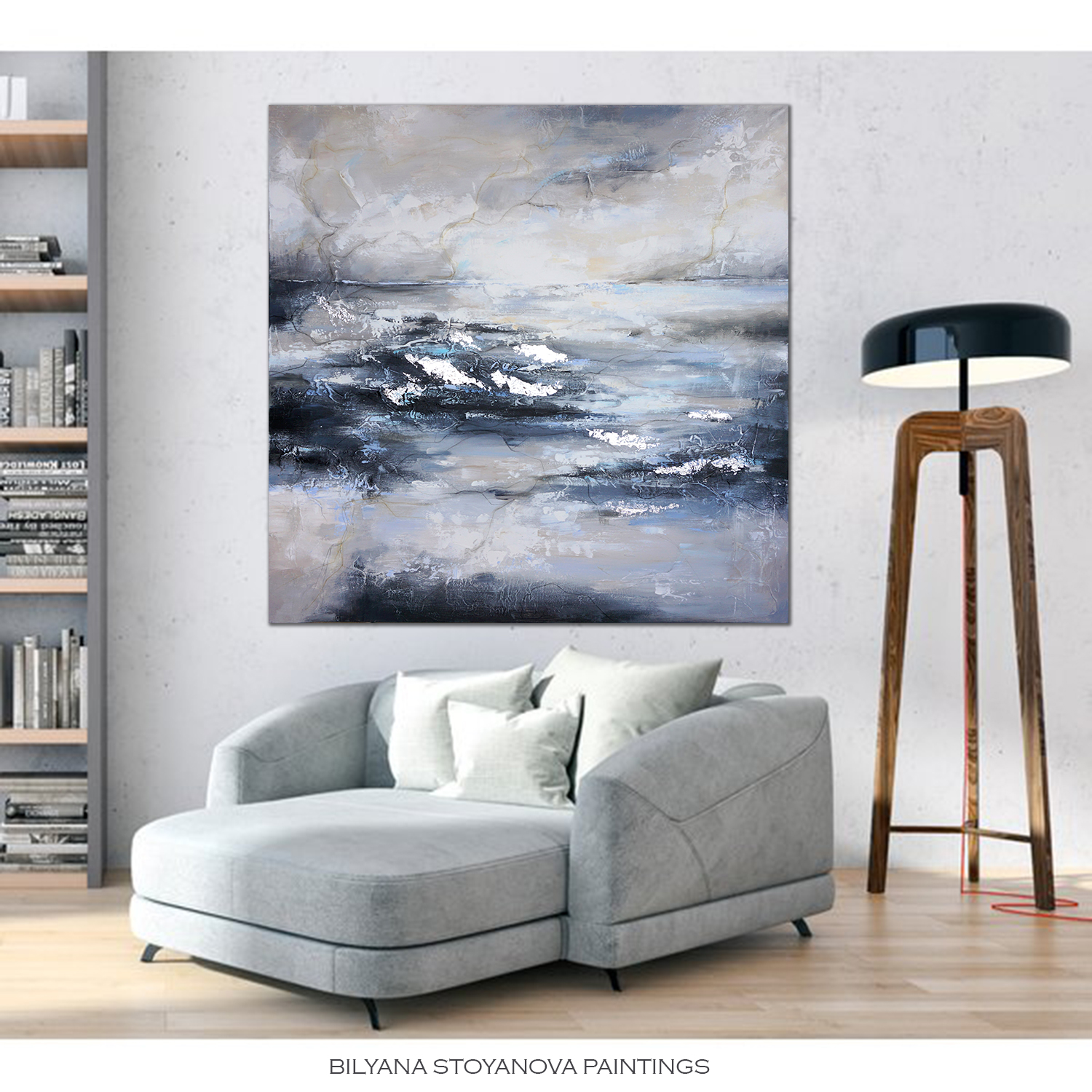 Media: High quality professional acrylic paint on canvas, special, Silver LeafColors: Grey, Beige, Blue, Navy, Silver LeafSize: 90 x 90cm on STRETCHED CANVAS - READY TO HANGFeel free to get in touch for any custom requests. I will gladly accept custom orders and size requests.~ABOUT THE PAINTING~This is the second piece from my "Shades Of Grey" Art Series. The first has been sold.Shades of deep grey, navy and beige with a touch of blue, Silver Leaf. The modern composition is a fusion of soft pastels and striking deep grey, as bold brushstrokes and curves conquer muted tones of white and beige.Sky, sea, clouds and rocks. This artwork is inspired by nature...............................................................................................................Shipping WORLDWIDE from The Netherlands with DHL, UPS..............................................................................................................● HANDMADE Acrylic painting on canvas.● Material: Professional acrylic paints, canvas.● Available in Stretched and Unstretched.● The painting comes signed on the back.● A certificate of authenticity is included.● All artworks are signed and dated by the artist Bilyana Stoyanova.Thank you for supporting original fine art!