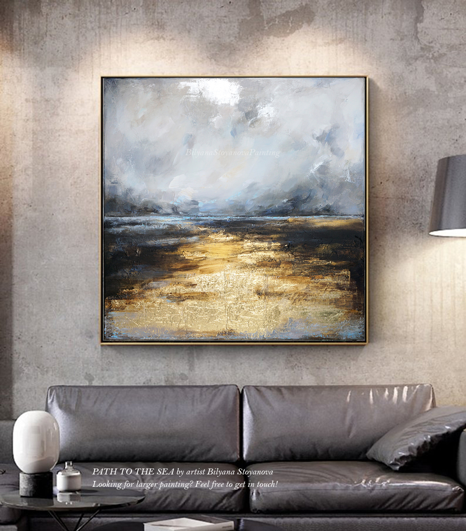 DETAILS● Media: High quality professional acrylic paint on canvas, special metallic paints, Gold Leaf● Colors: Grey, Beige, Brown, Blue, Gold, a touch of silver● Size: 100 x 100cm | 40" x 40" inches● Unstretched|Rolled in a tube● An additional 2" | 5cm on each side for easy stretching and framing● The painting comes signed on the back.● A certificate of authenticity is included.● All artworks are signed and dated by the artist Bilyana Stoyanova.Feel free to contact me for a custom size. I gladly accept custom orders and size requests.ORIGINAL MADE-TO-ORDER PAINTING - Direct from the artist 🎨Limited Recreations, each painting comes with certificate of authenticity, signed and dated by the artist Bilyana Stoyanova ✌️This is MADE-TO-ORDER painting from my original artwork on canvas.I will recreate a very similar painting for you in the same style and colors.You will receive the same quality and beauty of the painting that you see in the pictures.It will take me about 8-10 business days to recreate this painting. You will receive photos for your approval.Working closely with US and UK based interior designers and customers I have extensive experience in creating custom art for professional projects. Thank you to all my customers for more than 100 ★★★★★ reviews!..............................................................................................................Shipping WORLDWIDE from The Netherlands with DHL, UPS..............................................................................................................~ABOUT THE PAINTING~Shades of beige and grey with deep brown and Gold Leaf. Blue is a magnificent feng shui color. It ranges from gentle sky blue and serene blue-grey color of the ocean to the deep grey. The gentle and warm colors of this palette make the cold shades look warm. Layers of acrylic paint and texture gives the painting an interesting twist. This artwork is inspired by nature.FOR YOUR INFORMATION:The painting looks wonderful in horizontal, vertical and square format.Note: The watermark (BilyanaARTStudio) that you see on this image will not appear on the original painting. It is manually placed on the digital image to protect the copyright. Interior photos are for illustration purposes only and may not be to scale. Frame not included.Copyright:All the artworks in my gallery are original paintings and intellectual author's works created by the artist Bilyana Stoyanova. They are property of the artist and protected by Intellectual property law. Only the author has the rights to reproduce the original work.SHIPPINGUPS, Fedex, DHL for delivery, with full tracking. Each painting is inspected and professionally packaged for safe travel to ensure your painting arrives in perfect condition.Contact me anytime if you have any questions about the delivery or for any other reason!