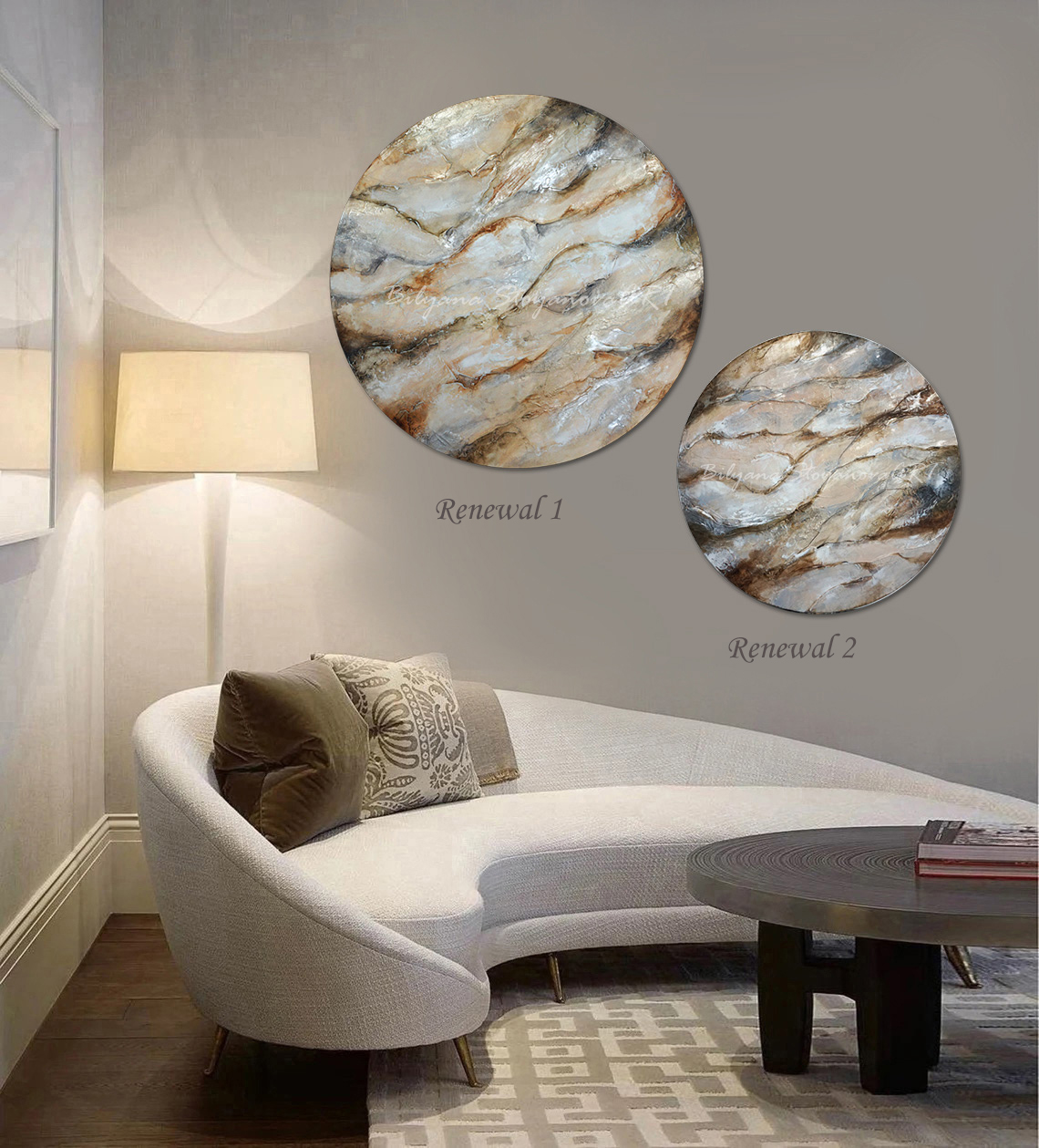 The gentle and warm colors of this palette make the cold shades look warm. Layers of acrylic paint and texture gives the painting an interesting twist. This artwork is inspired by nature.