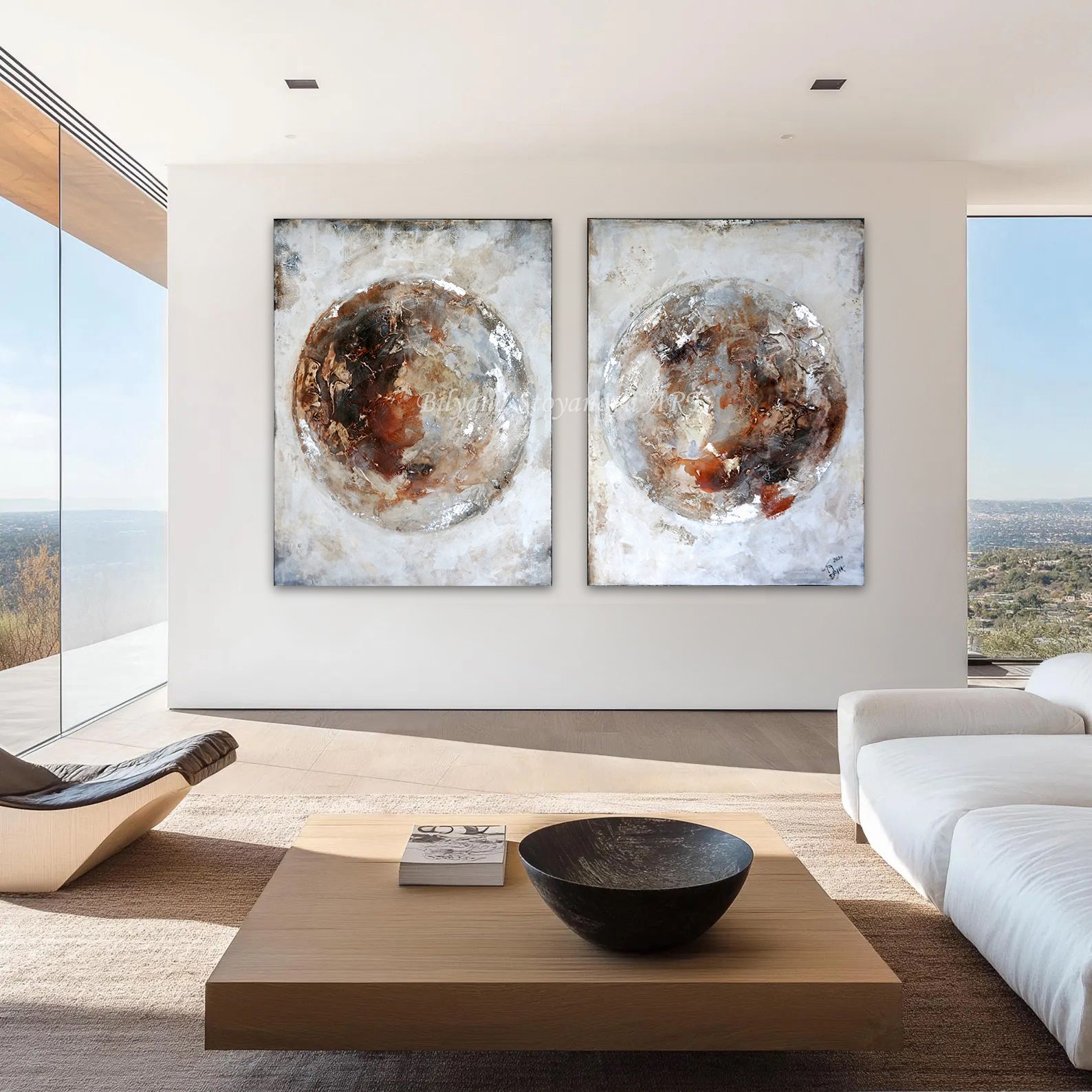 Original Contemporary Diptych in grey, beige, brown and silver, designed and created by artist Bilyana Stoyanova, Textured Organic Wabi Sabi Inspired Art, Two Circles, Minimalist, Relaxing painting, Neutral Living, Office decor, Art Gift, Art for All Seasons